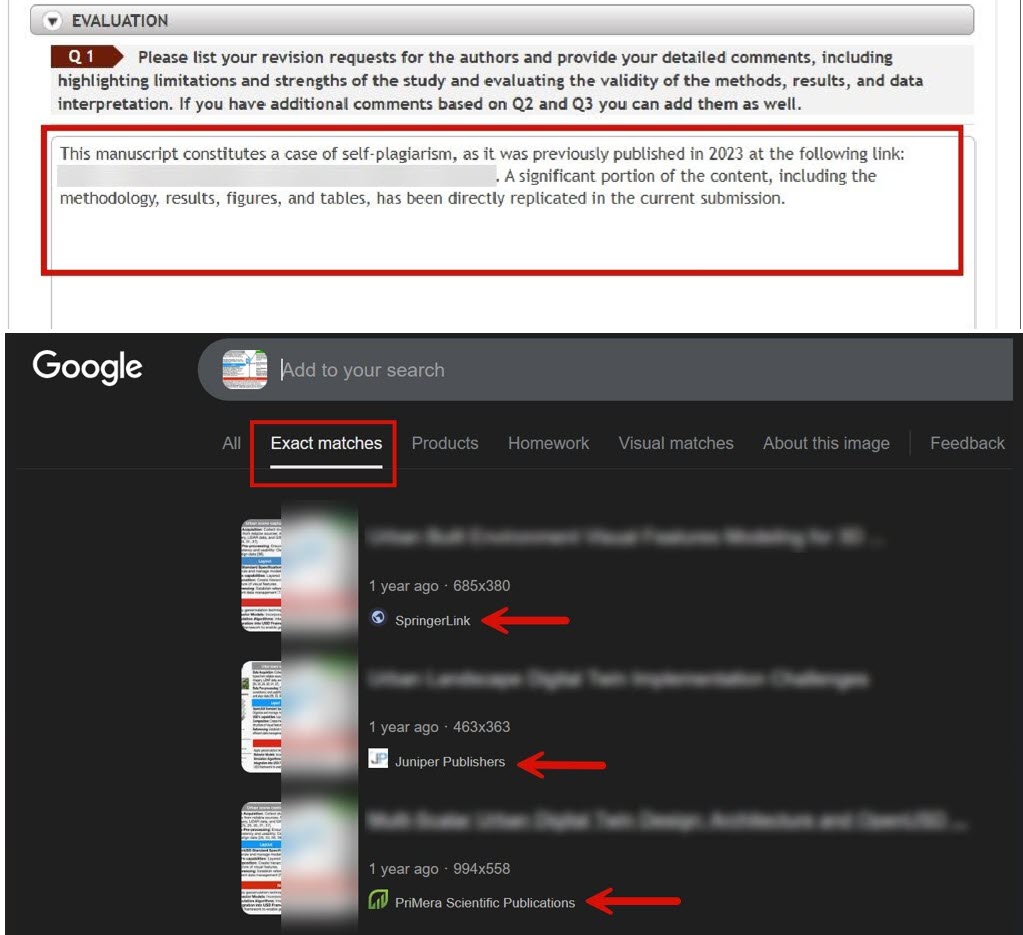 A useful tip for reviewers is to begin the review process by copying one of the figures (the nice one) and use Google Image search with the “Exact Matches” option, this can save valuable time.