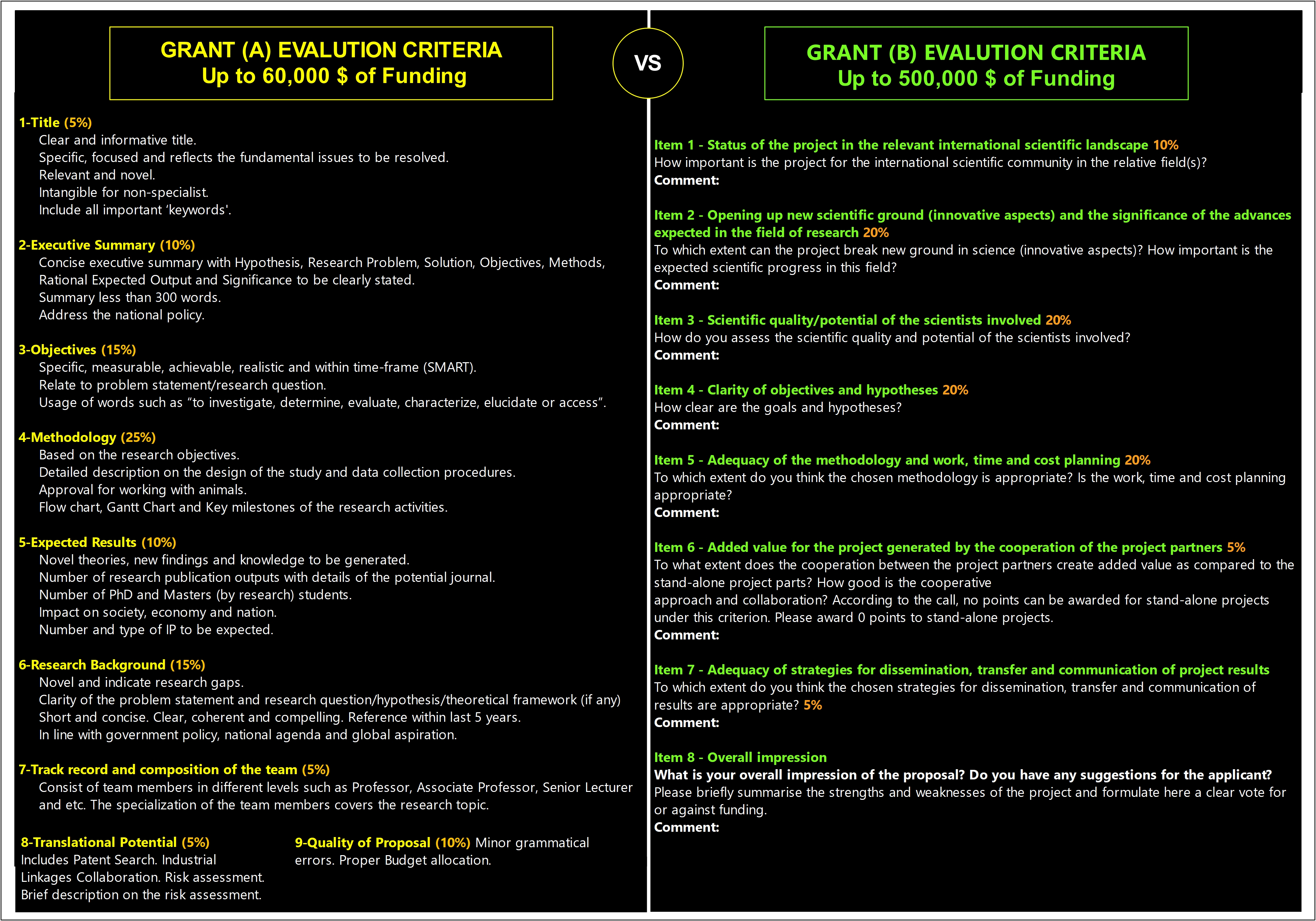 For example, consider the evaluation criteria of two different grants. Grant A offers a maximum of $50,000, while Grant B provides up to $500,000. Interestingly, Grant A allocates points to relatively minor aspects such as the quality of writing (title, abstract, formatting), whereas Grant B places greater emphasis on scientific merit, significance, collaboration, and the potential of the project team.